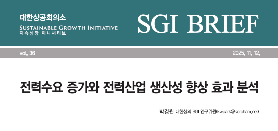 - 대한상의 SGI, ''전력수요 증가와 전력산업 생산성 향상 효과 분석'' 보고서 발표 - 2030년대까지 전력수요 연 2% 증가.. 공급여건 개선 없이는 전력가격 0.8%p 추가 상승 전망 - 동일 설비·인력으로 더 많은 전력 산출량 만들면... 전력가격은 하락하고 GDP는 상승 - SGI 제언: ① 수요자 중심 전력거래 방식 확립, ② 발전-송배전-수요관리 기술혁신, ③ 전력산업 인재 양성